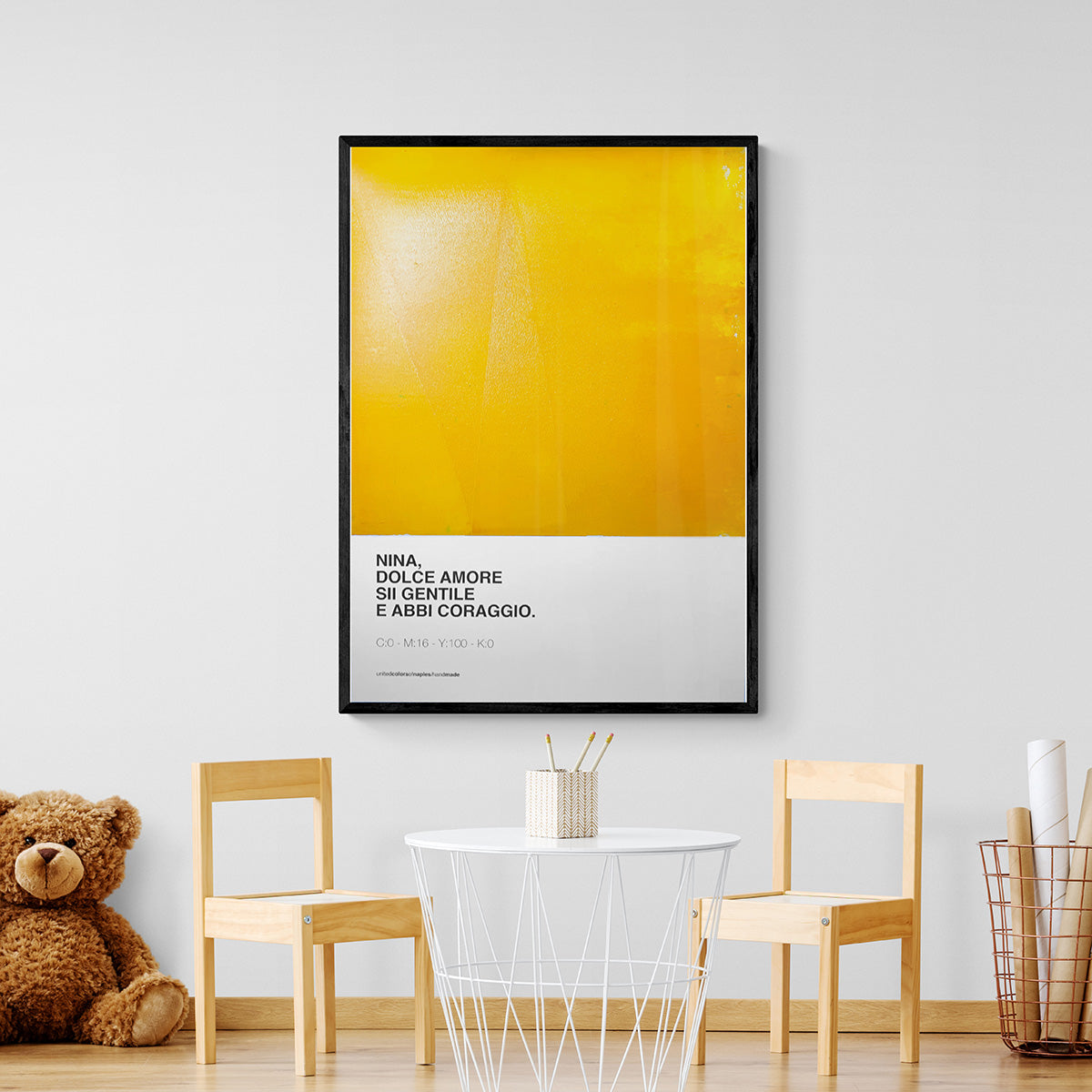 Questa Opera Poster è un sussurro speciale, ispirato al dolce messaggio: "Sii gentile e abbi coraggio." Un promemoria colorato per i più piccoli, per affrontare ogni giorno con il cuore aperto e la forza di un sorriso.